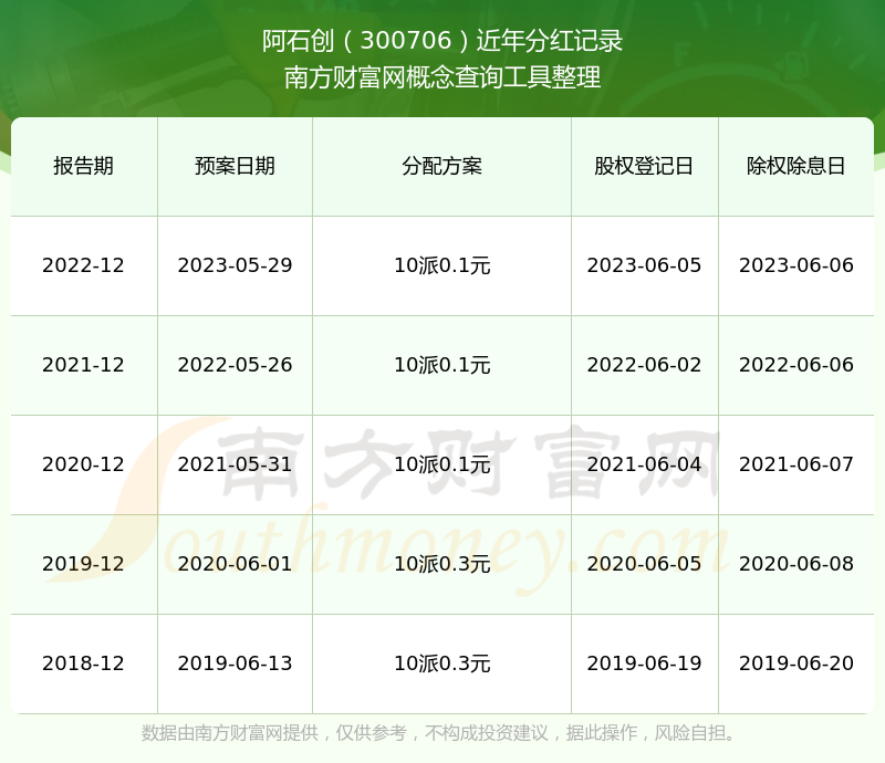 阿石創(chuàng)最新一次公布的分紅方案為10派0.1元。本次權益分派股權登記日為2023年6月5日,除權除息日為2023年6月6日,派息日為2023年6月6日。