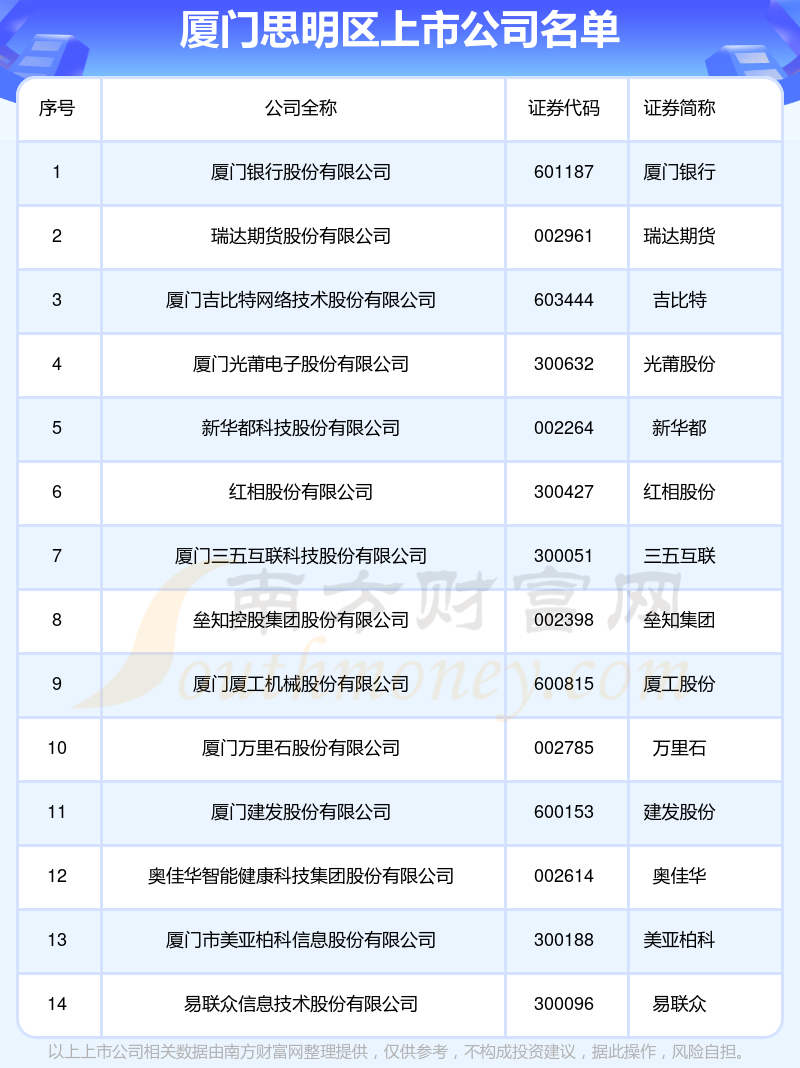 從數(shù)量方面來看,截至12月13日,廈門思明區(qū)共有14家A股上市公司。具體分布為,上交所:建發(fā)股份、廈工股份、廈門銀行、吉比特等4家,深交所:新華都、壘知集團(tuán)、奧佳華、萬里石、瑞達(dá)期貨、璉升科技、易聯(lián)眾、國投智能、紅相股份、光莆股份等10家。