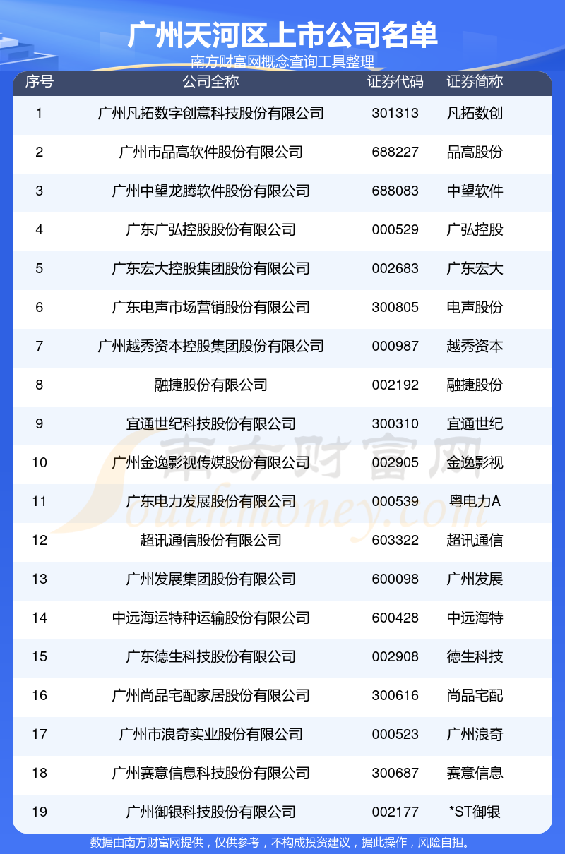 廣州天河區(qū)的上市公司都有哪些?南方財(cái)富網(wǎng)趨勢(shì)選股系統(tǒng)為您整理了歸屬于廣州天河區(qū),并且在A股上市的公司。