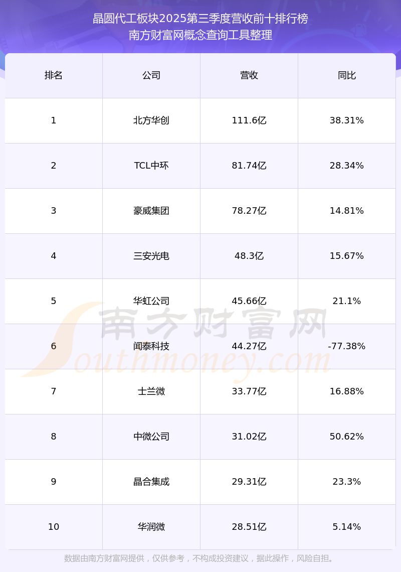 按照南方財富網(wǎng)概念查詢工具統(tǒng)計,該股所屬板塊為晶圓代工板塊,該板塊共有35只股票,晶合集成2025第三季度營收在該板塊中排名為第9名,該板塊2025第三季度營收排名前十的股票如下表: