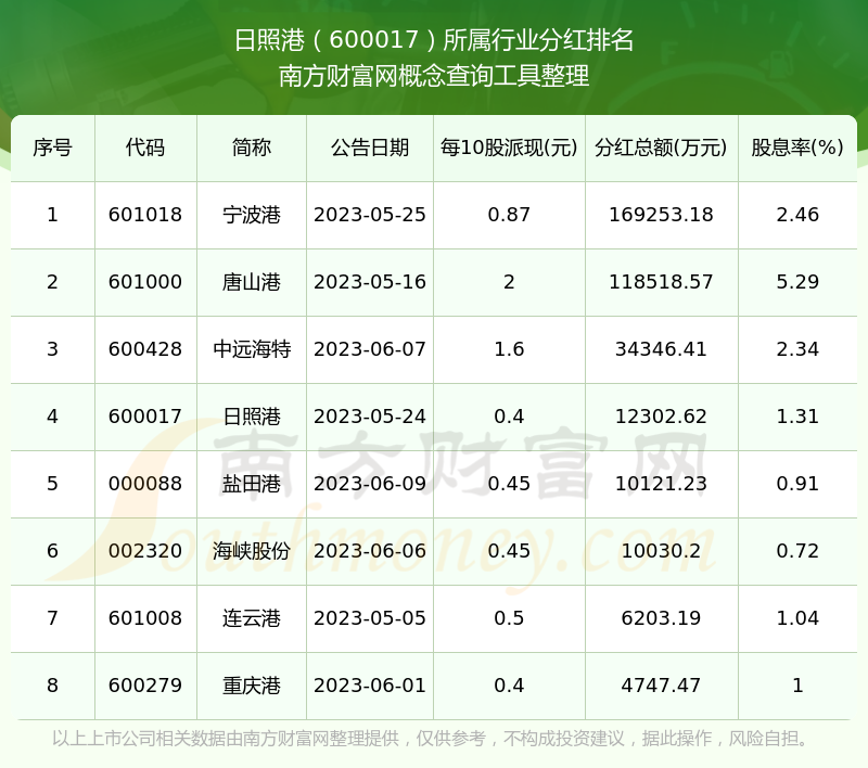 按照南方財富網(wǎng)趨勢選股系統(tǒng)統(tǒng)計,日照港所屬行業(yè)為航運港口行業(yè),航運港口行業(yè)分紅排名情況如下表:
