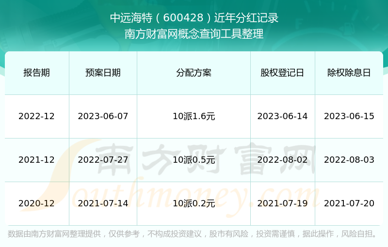 中遠(yuǎn)海特最新一次公布的分紅方案為10派1.6元。本次權(quán)益分派股權(quán)登記日為2023年6月14日,除權(quán)除息日為2023年6月15日,派息日為2023年6月15日。