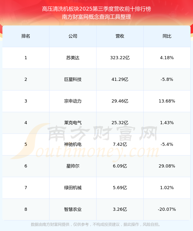 按照南方財(cái)富網(wǎng)概念查詢工具統(tǒng)計(jì),該股所屬板塊為高壓清洗機(jī)板塊,該板塊共有8只股票,綠田機(jī)械2025第三季度營收在該板塊中排名為第7名,該板塊2025第三季度營收排名前十的股票如下表:
