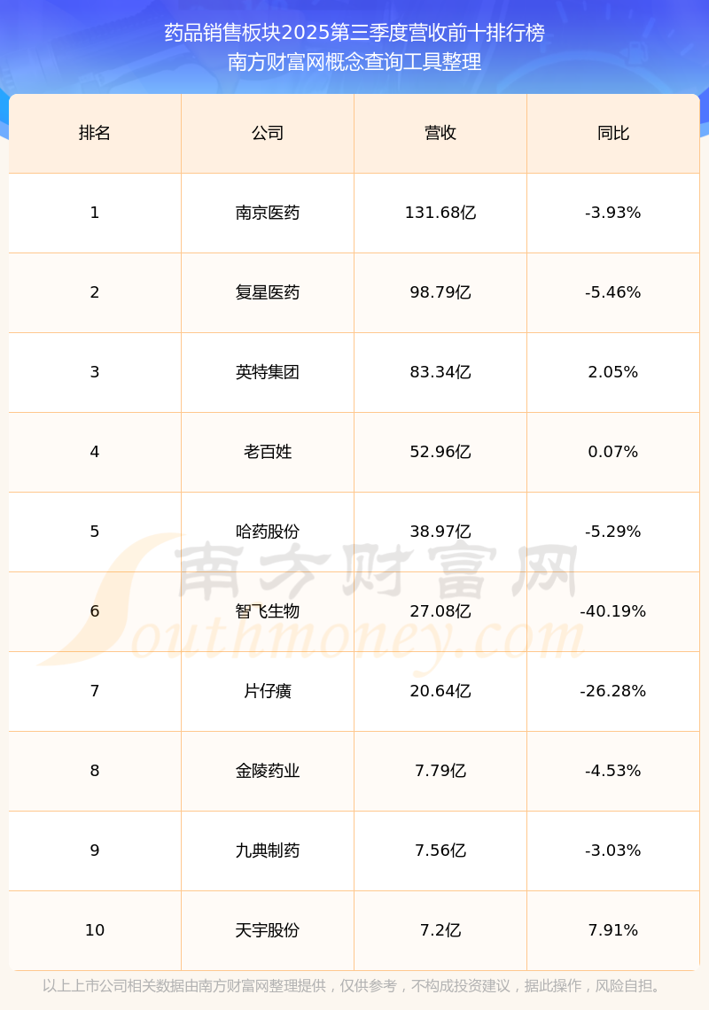 按照南方財(cái)富網(wǎng)概念查詢工具統(tǒng)計(jì),該股所屬板塊為藥品銷售板塊,該板塊共有18只股票,華海藥業(yè)2025第三季度營(yíng)收在該板塊中排名為第18名,該板塊2025第三季度營(yíng)收排名前十的股票如下表:
