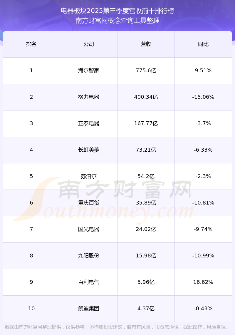 按照南方財(cái)富網(wǎng)概念查詢工具統(tǒng)計(jì),該股所屬板塊為電器板塊,該板塊共有11只股票,熱威股份2025第三季度營(yíng)收在該板塊中排名為第11名,該板塊2025第三季度營(yíng)收排名前十的股票如下表: