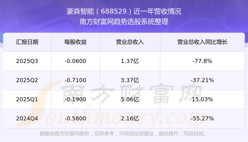 豪森智能2025年第三季度財報顯示,公司主營收入1.37億元,同比-77.8%;歸母凈利潤-1.08億元,同比-4444.42%;扣非凈利潤-1.12億元,同比-1014.76%。