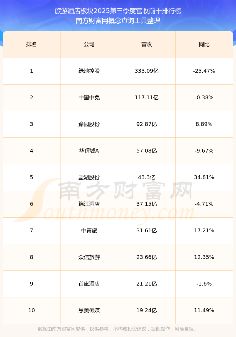 按照南方財(cái)富網(wǎng)概念查詢工具統(tǒng)計(jì),該股所屬板塊為旅游酒店板塊,該板塊共有69只股票,中國(guó)中免2025第三季度營(yíng)收在該板塊中排名為第2名,該板塊2025第三季度營(yíng)收排名前十的股票如下表: