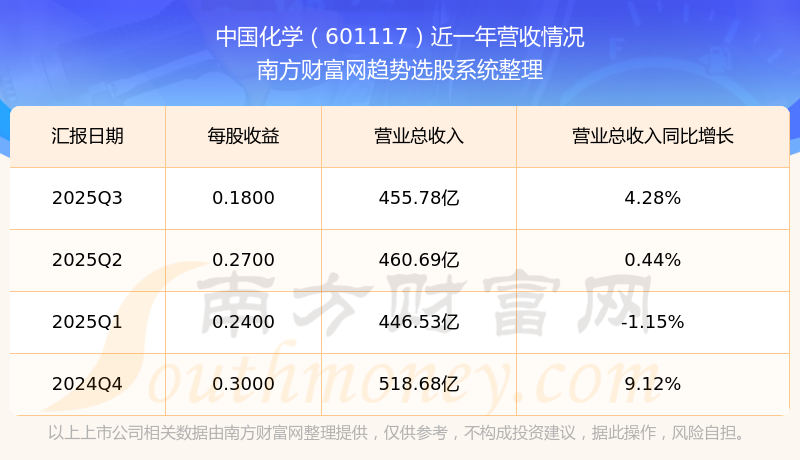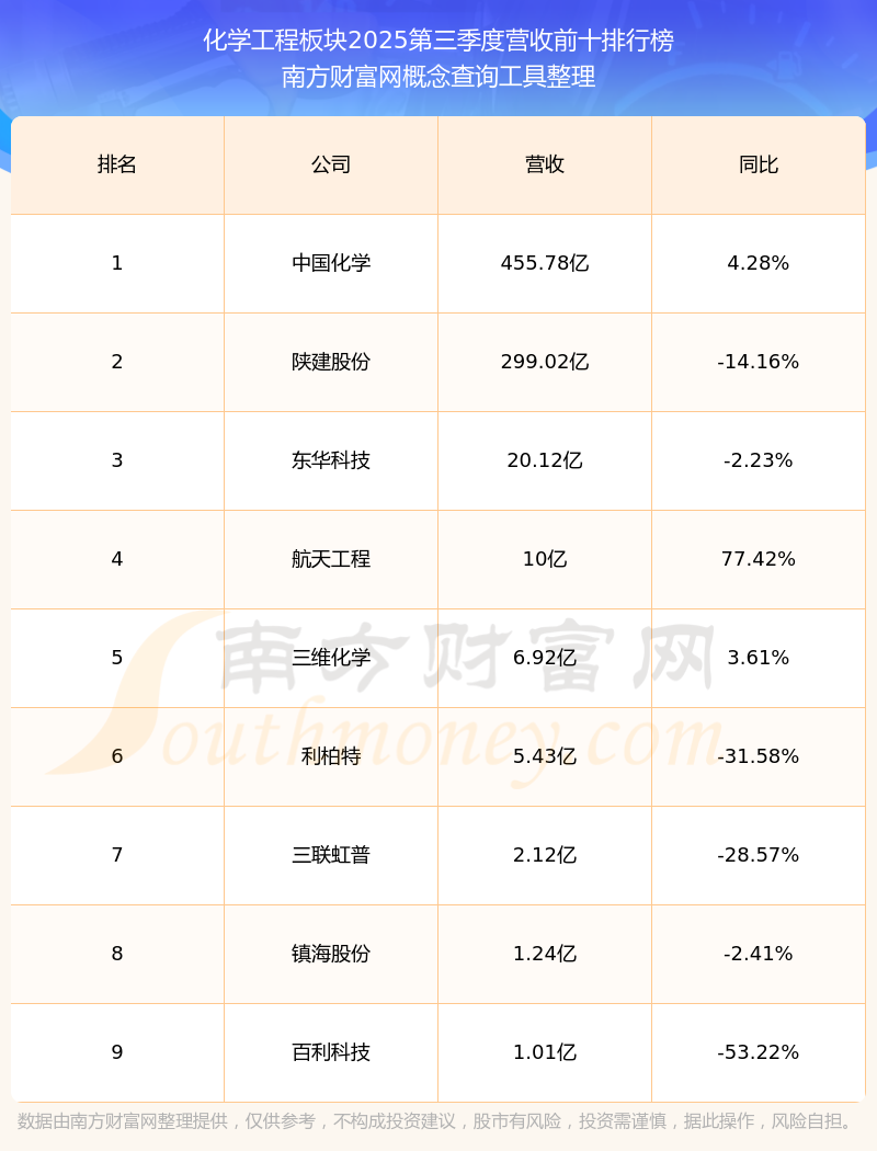 按照南方財(cái)富網(wǎng)概念查詢工具統(tǒng)計(jì),該股所屬板塊為化學(xué)工程板塊,該板塊共有9只股票,中國化學(xué)2025第三季度營收在該板塊中排名為第1名,該板塊2025第三季度營收排名前十的股票如下表: