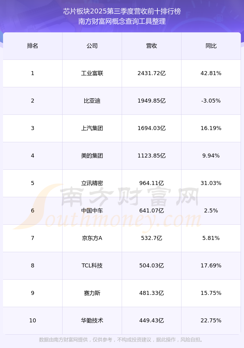 按照南方財富網(wǎng)概念查詢工具統(tǒng)計,該股所屬板塊為芯片板塊,該板塊共有900只股票,力合微2025第三季度營收在該板塊中排名為第853名,該板塊2025第三季度營收排名前十的股票如下表: