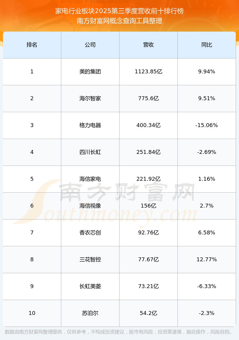 按照南方財富網(wǎng)概念查詢工具統(tǒng)計,該股所屬板塊為家電行業(yè)板塊,該板塊共有64只股票,榮泰健康2025第三季度營收在該板塊中排名為第50名,該板塊2025第三季度營收排名前十的股票如下表: