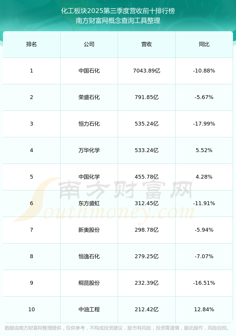 按照南方財(cái)富網(wǎng)概念查詢工具統(tǒng)計(jì),該股所屬板塊為化工板塊,該板塊共有569只股票,江山股份2025第三季度營(yíng)收在該板塊中排名為第184名,該板塊2025第三季度營(yíng)收排名前十的股票如下表: