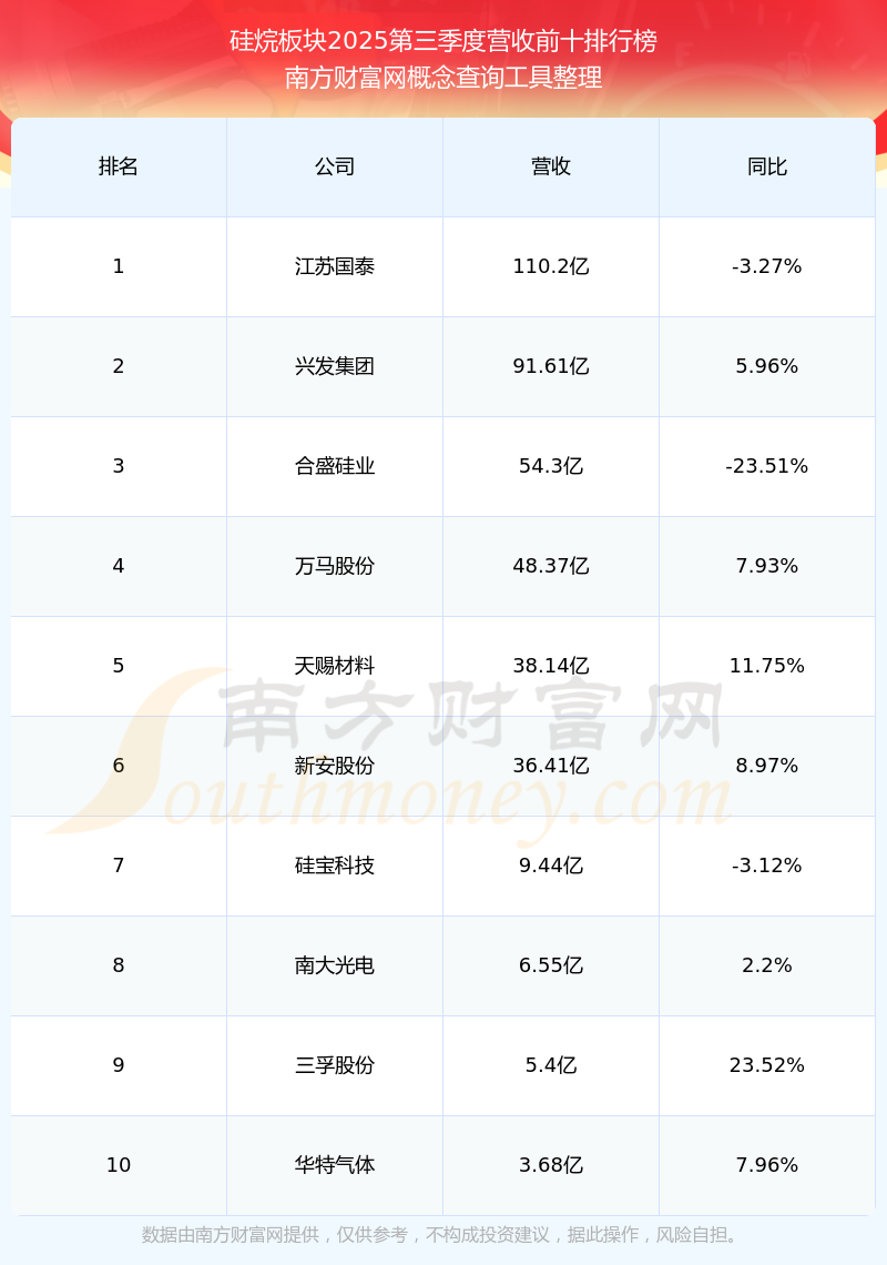按照南方財(cái)富網(wǎng)概念查詢工具統(tǒng)計(jì),該股所屬板塊為硅烷板塊,該板塊共有13只股票,晨光新材2025第三季度營(yíng)收在該板塊中排名為第12名,該板塊2025第三季度營(yíng)收排名前十的股票如下表: