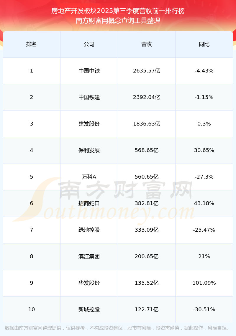 按照南方財富網(wǎng)概念查詢工具統(tǒng)計,該股所屬板塊為房地產(chǎn)開發(fā)板塊,該板塊共有142只股票,萬通發(fā)展2025第三季度營收在該板塊中排名為第114名,該板塊2025第三季度營收排名前十的股票如下表: