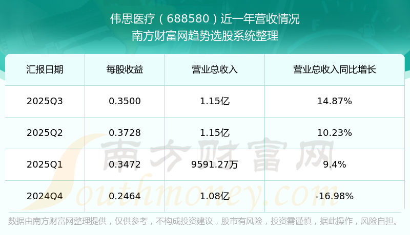 按照南方財(cái)富網(wǎng)概念查詢工具統(tǒng)計(jì),該股所屬板塊為醫(yī)療器械板塊,該板塊共有406只股票,偉思醫(yī)療2025第三季度營收在該板塊中排名為第335名,該板塊2025第三季度營收排名前十的股票如下表: