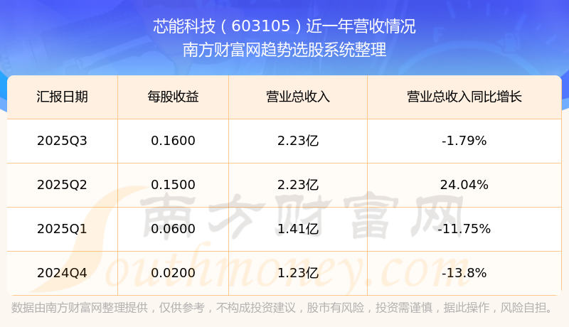 芯能科技2025年第三季度顯示,公司主營收入2.23億元,同比-1.79%;歸母凈利潤8079.85萬元,同比-1.29%;扣非凈利潤8018.77萬元,同比-0.92%。