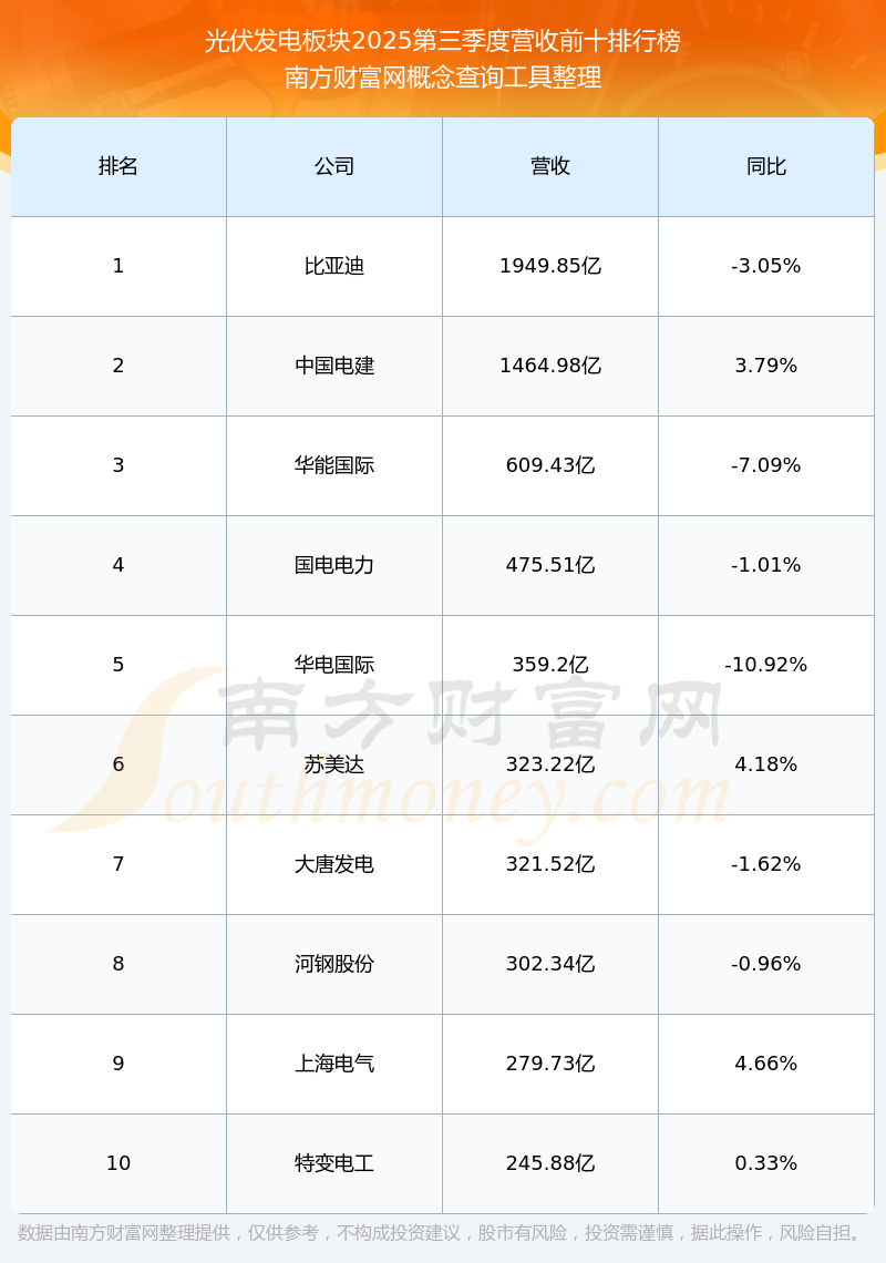 按照南方財富網(wǎng)概念查詢工具統(tǒng)計,該股所屬板塊為光伏發(fā)電板塊,該板塊共有248只股票,芯能科技2025第三季度營收在該板塊中排名為第217名,該板塊2025第三季度營收排名前十的股票如下表: