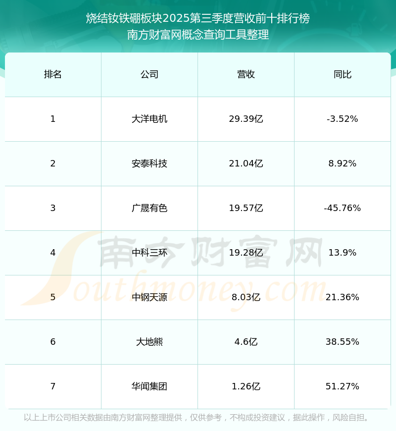 按照南方財富網概念查詢工具統(tǒng)計,該股所屬板塊為燒結釹鐵硼板塊,該板塊共有7只股票,大地熊2025第三季度營收在該板塊中排名為第6名,該板塊2025第三季度營收排名前十的股票如下表: