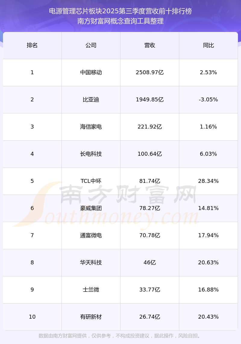 按照南方財富網(wǎng)概念查詢工具統(tǒng)計,該股所屬板塊為電源管理芯片板塊,該板塊共有42只股票,英集芯2025第三季度營收在該板塊中排名為第28名,該板塊2025第三季度營收排名前十的股票如下表: