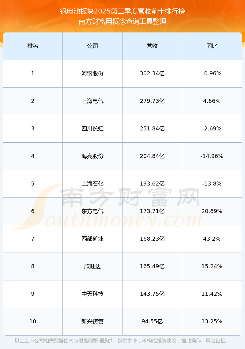按照南方財(cái)富網(wǎng)概念查詢工具統(tǒng)計(jì),該股所屬板塊為釩電池板塊,該板塊共有50只股票,振華股份2025第三季度營(yíng)收在該板塊中排名為第27名,該板塊2025第三季度營(yíng)收排名前十的股票如下表: