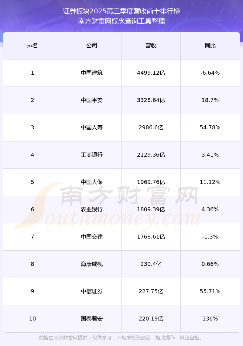 按照南方財(cái)富網(wǎng)概念查詢工具統(tǒng)計(jì),該股所屬板塊為證券板塊,該板塊共有65只股票,華安證券2025第三季度營收在該板塊中排名為第33名,該板塊2025第三季度營收排名前十的股票如下表: