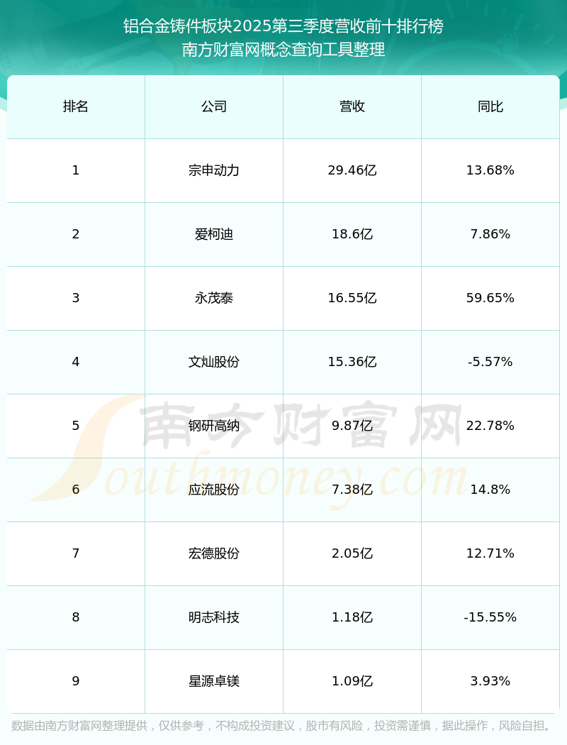按照南方財富網(wǎng)概念查詢工具統(tǒng)計,該股所屬板塊為鋁合金鑄件板塊,該板塊共有9只股票,文燦股份2025第三季度營收在該板塊中排名為第4名,該板塊2025第三季度營收排名前十的股票如下表: