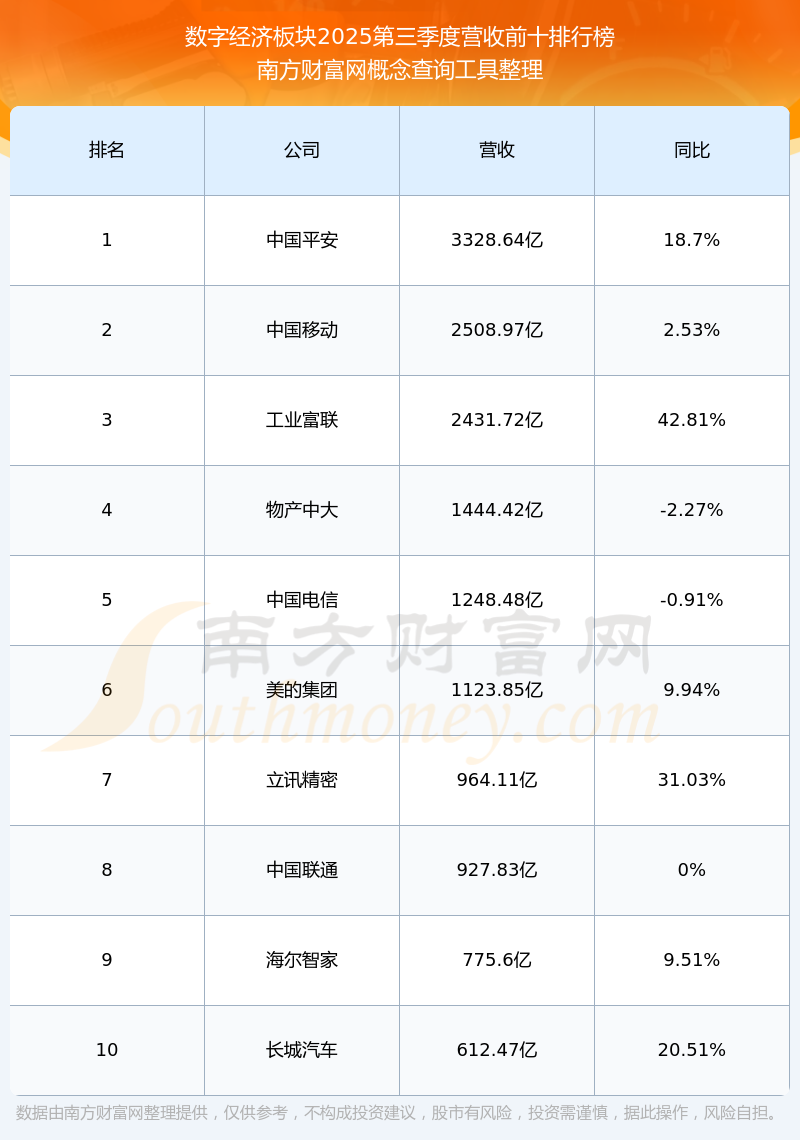 按照南方財富網(wǎng)概念查詢工具統(tǒng)計,該股所屬板塊為數(shù)字經(jīng)濟板塊,該板塊共有389只股票,海南華鐵2025第三季度營收在該板塊中排名為第110名,該板塊2025第三季度營收排名前十的股票如下表: