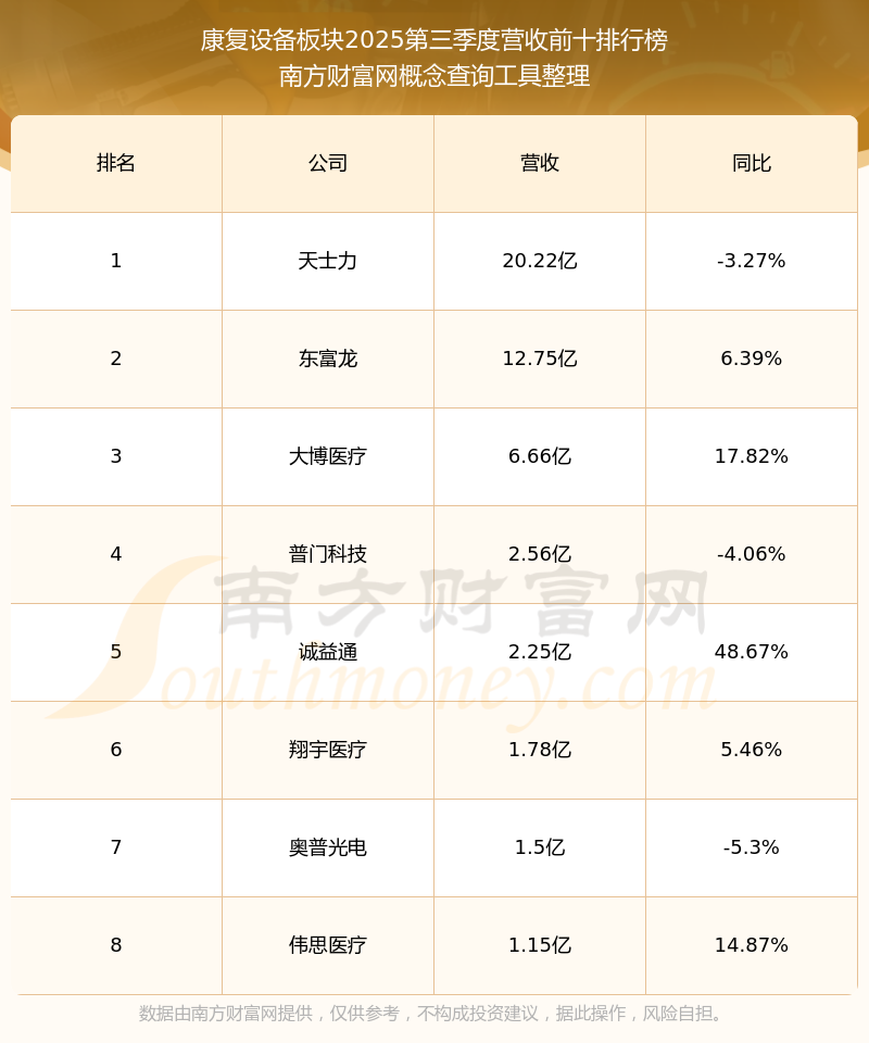 按照南方財富網概念查詢工具統(tǒng)計,該股所屬板塊為康復設備板塊,該板塊共有8只股票,麥瀾德2025第三季度營收在該板塊中排名為第8名,該板塊2025第三季度營收排名前十的股票如下表: