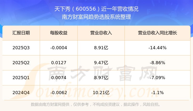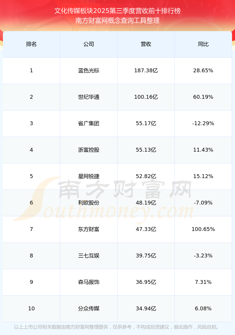 按照南方財富網(wǎng)概念查詢工具統(tǒng)計,該股所屬板塊為文化傳媒板塊,該板塊共有240只股票,天下秀2025第三季度營收在該板塊中排名為第63名,該板塊2025第三季度營收排名前十的股票如下表: