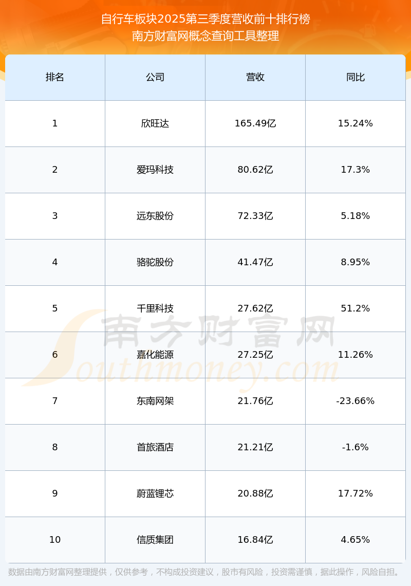 按照南方財(cái)富網(wǎng)概念查詢工具統(tǒng)計(jì),該股所屬板塊為自行車板塊,該板塊共有36只股票,中路股份2025第三季度營收在該板塊中排名為第28名,該板塊2025第三季度營收排名前十的股票如下表: