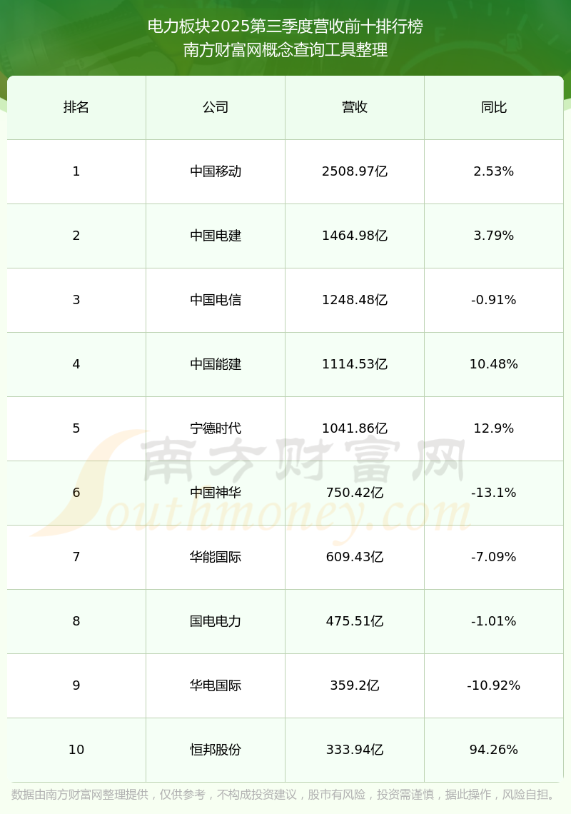 按照南方財富網(wǎng)概念查詢工具統(tǒng)計,該股所屬板塊為電力板塊,該板塊共有237只股票,蘇能股份2025第三季度營收在該板塊中排名為第237名,該板塊2025第三季度營收排名前十的股票如下表: