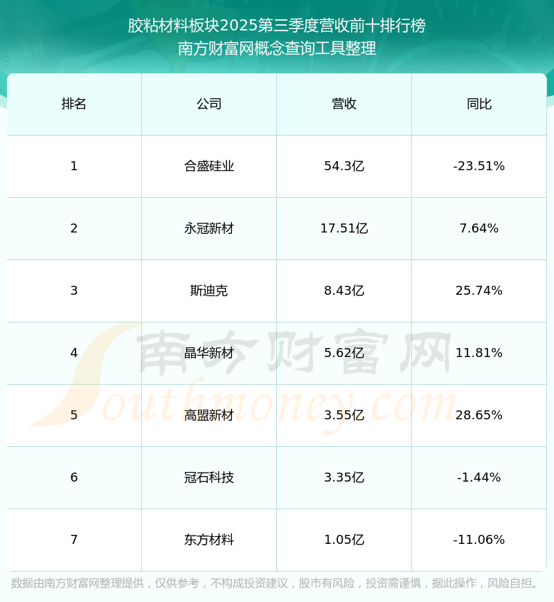 按照南方財富網(wǎng)概念查詢工具統(tǒng)計(jì),該股所屬板塊為膠粘材料板塊,該板塊共有7只股票,冠石科技2025第三季度營收在該板塊中排名為第6名,該板塊2025第三季度營收排名前十的股票如下表: