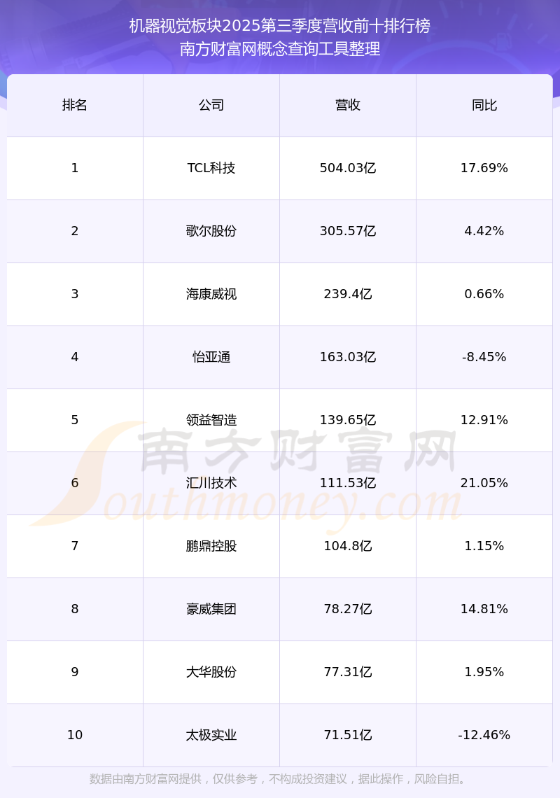 按照南方財富網(wǎng)概念查詢工具統(tǒng)計,該股所屬板塊為機器視覺板塊,該板塊共有175只股票,凌云光2025第三季度營收在該板塊中排名為第42名,該板塊2025第三季度營收排名前十的股票如下表: