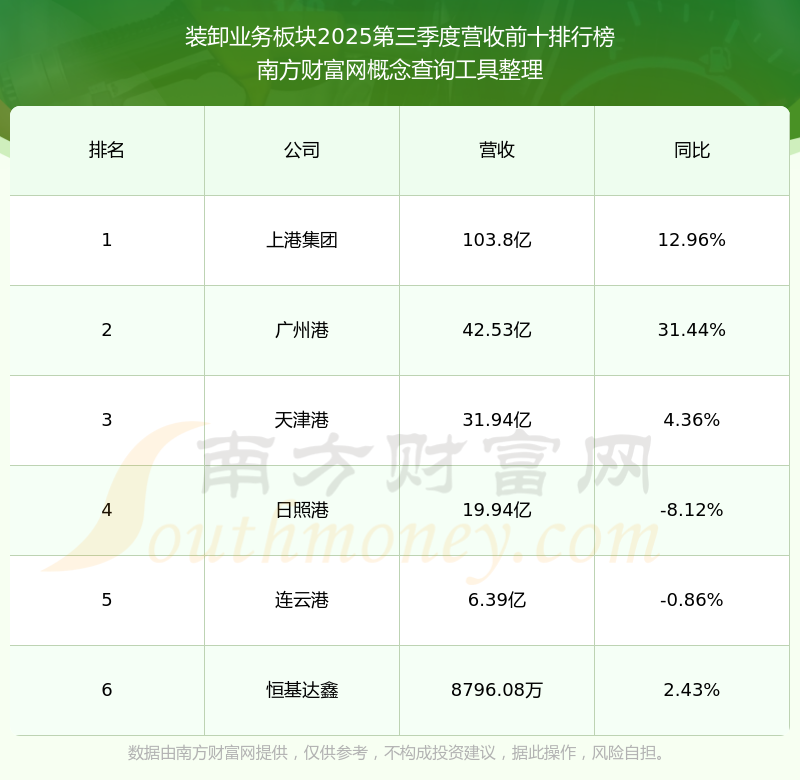 按照南方財富網(wǎng)概念查詢工具統(tǒng)計,該股所屬板塊為裝卸業(yè)務(wù)板塊,該板塊共有6只股票,連云港2025第三季度營收在該板塊中排名為第5名,該板塊2025第三季度營收排名前十的股票如下表:
