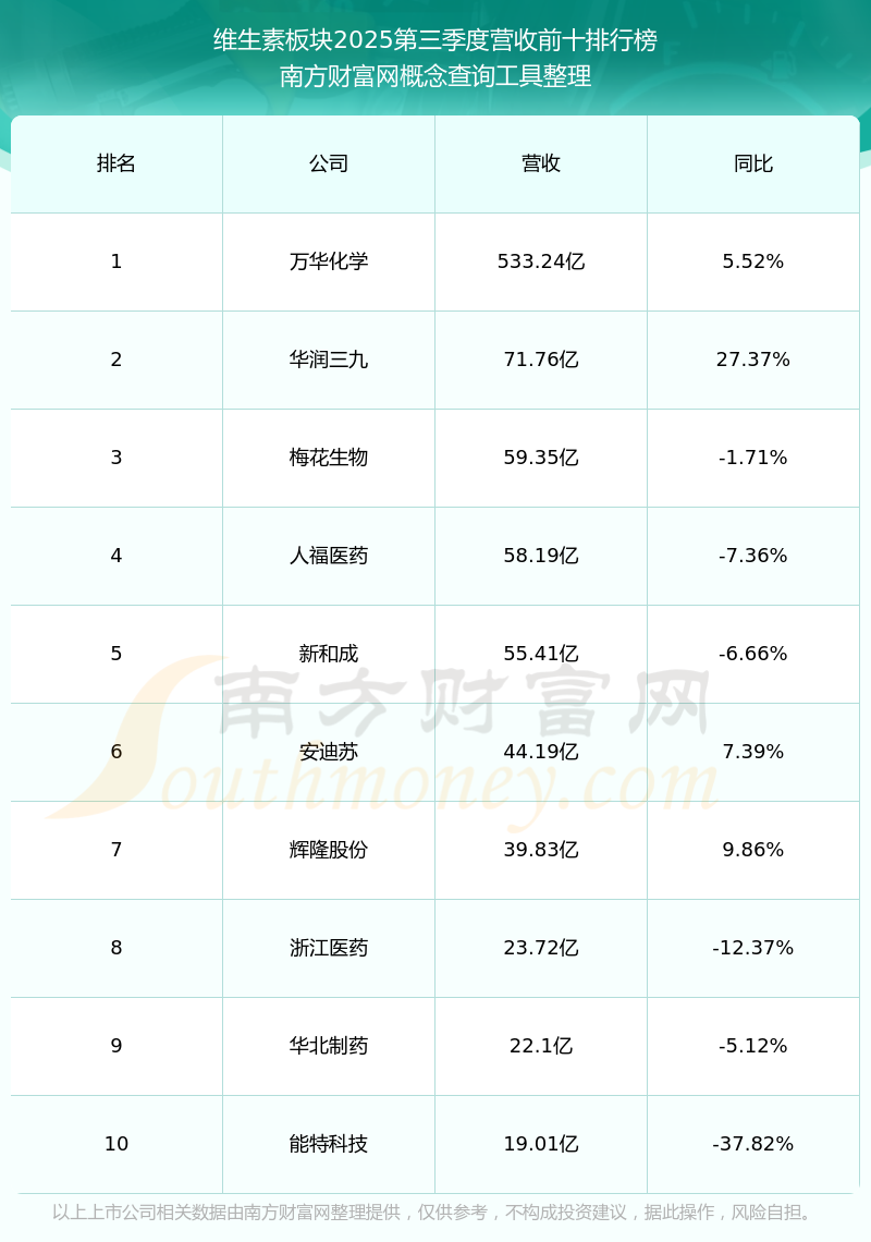 按照南方財富網概念查詢工具統(tǒng)計,該股所屬板塊為維生素板塊,該板塊共有60只股票,天新藥業(yè)2025第三季度營收在該板塊中排名為第34名,該板塊2025第三季度營收排名前十的股票如下表: