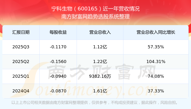 寧科生物(600165)發(fā)布2025年第三季度財(cái)報(bào)。2025年第三季度寧科生物實(shí)現(xiàn)營(yíng)業(yè)收入1.12億元,同比增加57.35元%,環(huán)比增加-8.22%;凈利潤(rùn)為-7997.89萬元,同比增長(zhǎng)-46.54%,環(huán)比增長(zhǎng)25.2%。