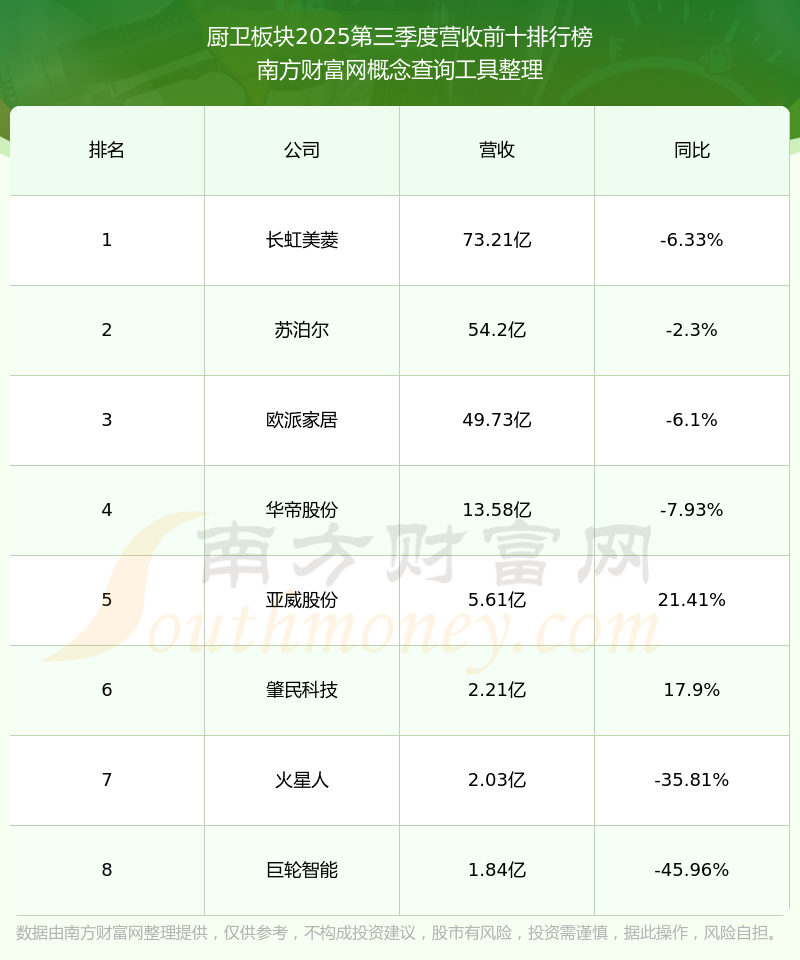 按照南方財富網(wǎng)概念查詢工具統(tǒng)計,該股所屬板塊為廚衛(wèi)板塊,該板塊共有8只股票,松霖科技2025第三季度營收在該板塊中排名為第8名,該板塊2025第三季度營收排名前十的股票如下表: