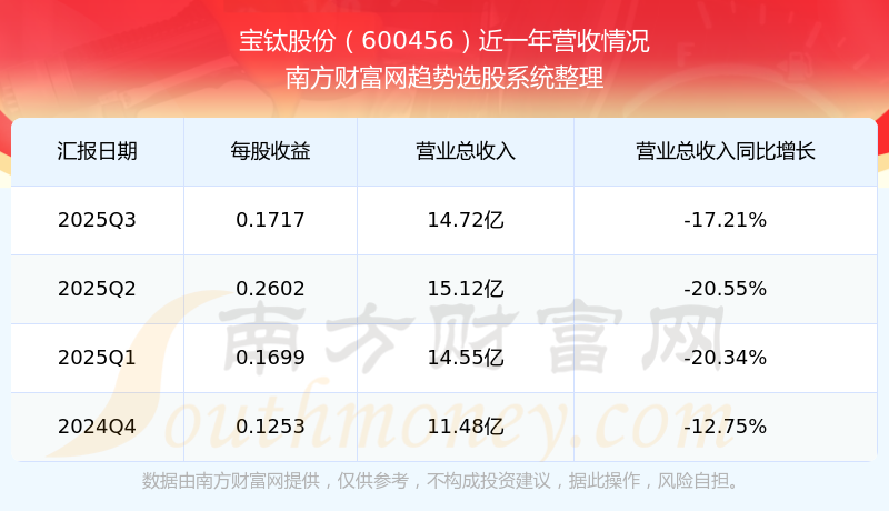 寶鈦股份披露了2025年第三季度財(cái)報(bào)。報(bào)告顯示,寶鈦股份2025年第三季度實(shí)現(xiàn)營(yíng)收14.72億元,同比-17.21%;歸母凈利潤(rùn)8205.63萬元,同比-27.8%。