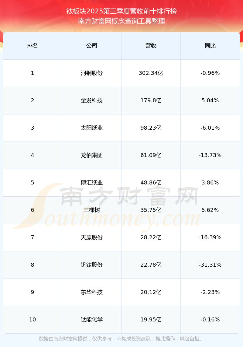 按照南方財(cái)富網(wǎng)概念查詢工具統(tǒng)計(jì),該股所屬板塊為鈦板塊,該板塊共有28只股票,寶鈦股份2025第三季度營(yíng)收在該板塊中排名為第11名,該板塊2025第三季度營(yíng)收排名前十的股票如下表: