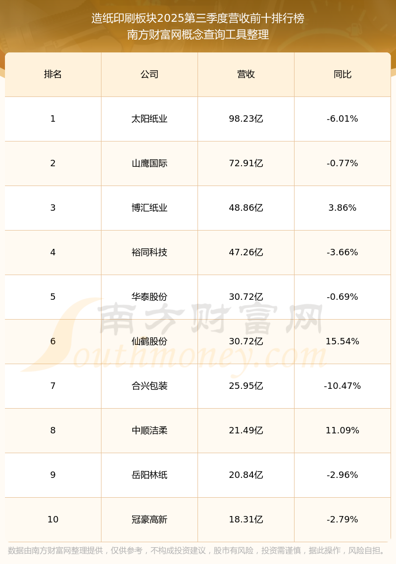 按照南方財富網(wǎng)概念查詢工具統(tǒng)計,該股所屬板塊為造紙印刷板塊,該板塊共有47只股票,博匯紙業(yè)2025第三季度營收在該板塊中排名為第3名,該板塊2025第三季度營收排名前十的股票如下表:
