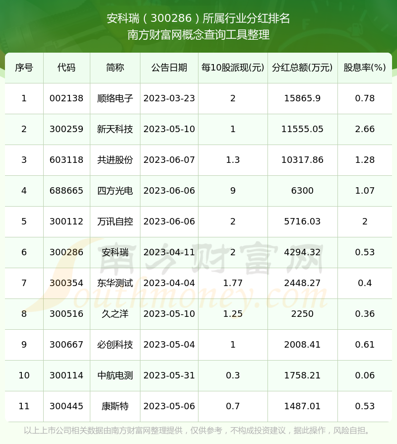 按照南方財富網(wǎng)趨勢選股系統(tǒng)統(tǒng)計,安科瑞所屬行業(yè)為傳感器行業(yè),傳感器行業(yè)分紅排名情況如下表: