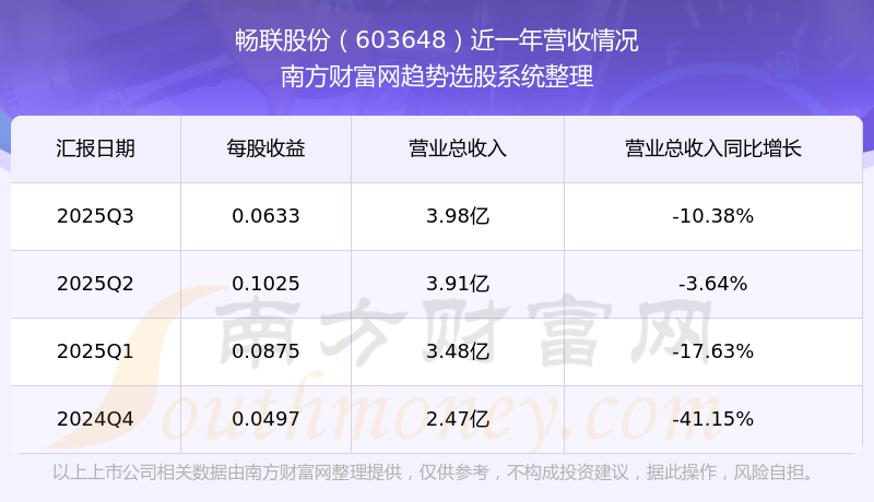 暢聯(lián)股份2025年第三季度財報顯示,公司主營收入3.98億元,同比-10.38%;歸母凈利潤2295.45萬元,同比-29.26%;扣非凈利潤2331.42萬元,同比-25.99%。