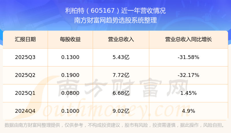 財(cái)報(bào)顯示,2025年第三季度利柏特營(yíng)收5.43億元,同比增長(zhǎng)-31.58%,凈利潤(rùn)5639.14萬元,同比增長(zhǎng)-19.69%。