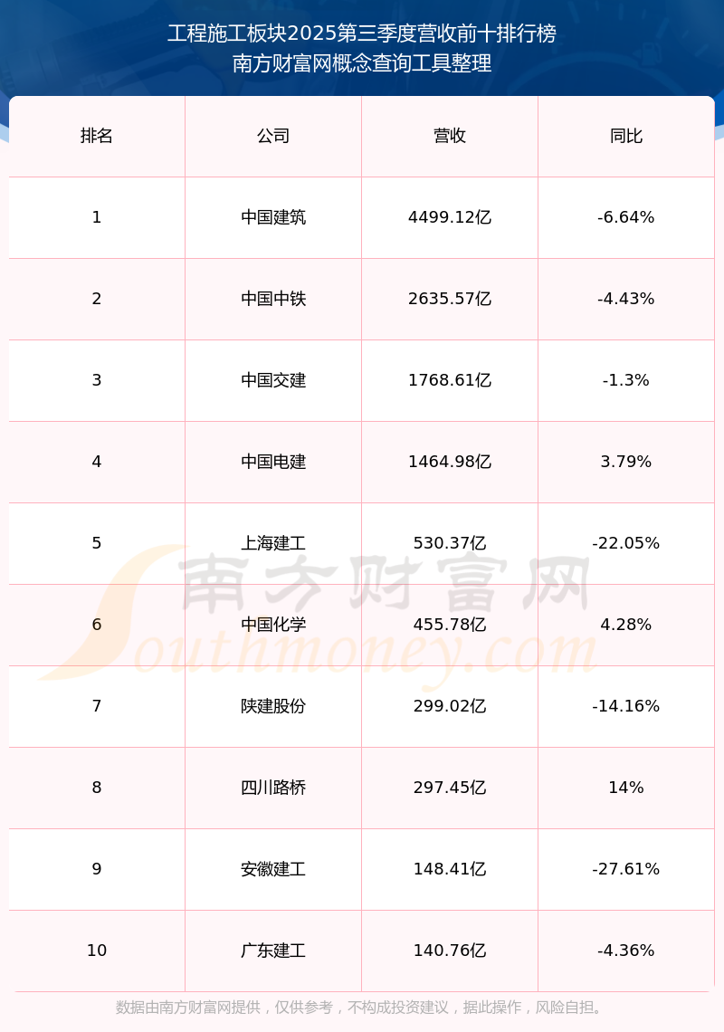 按照南方財(cái)富網(wǎng)概念查詢工具統(tǒng)計(jì),該股所屬板塊為工程施工板塊,該板塊共有56只股票,利柏特2025第三季度營(yíng)收在該板塊中排名為第56名,該板塊2025第三季度營(yíng)收排名前十的股票如下表: