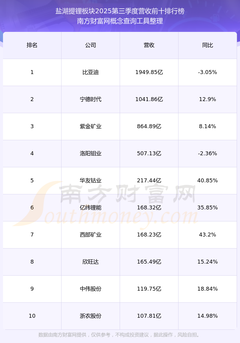 按照南方財富網概念查詢工具統(tǒng)計,該股所屬板塊為鹽湖提鋰板塊,該板塊共有72只股票,冠農股份2025第三季度營收在該板塊中排名為第57名,該板塊2025第三季度營收排名前十的股票如下表: