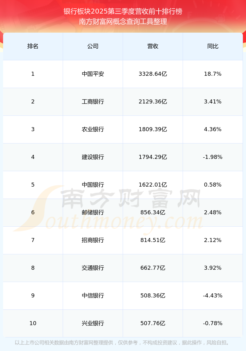 按照南方財富網(wǎng)概念查詢工具統(tǒng)計,該股所屬板塊為銀行板塊,該板塊共有44只股票,長沙銀行2025第三季度營收在該板塊中排名為第24名,該板塊2025第三季度營收排名前十的股票如下表: