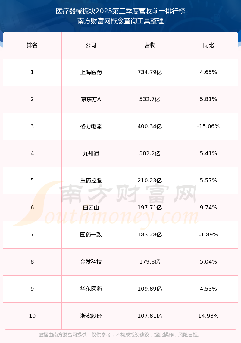 按照南方財富網(wǎng)概念查詢工具統(tǒng)計,該股所屬板塊為醫(yī)療器械板塊,該板塊共有406只股票,拱東醫(yī)療2025第三季度營收在該板塊中排名為第226名,該板塊2025第三季度營收排名前十的股票如下表: