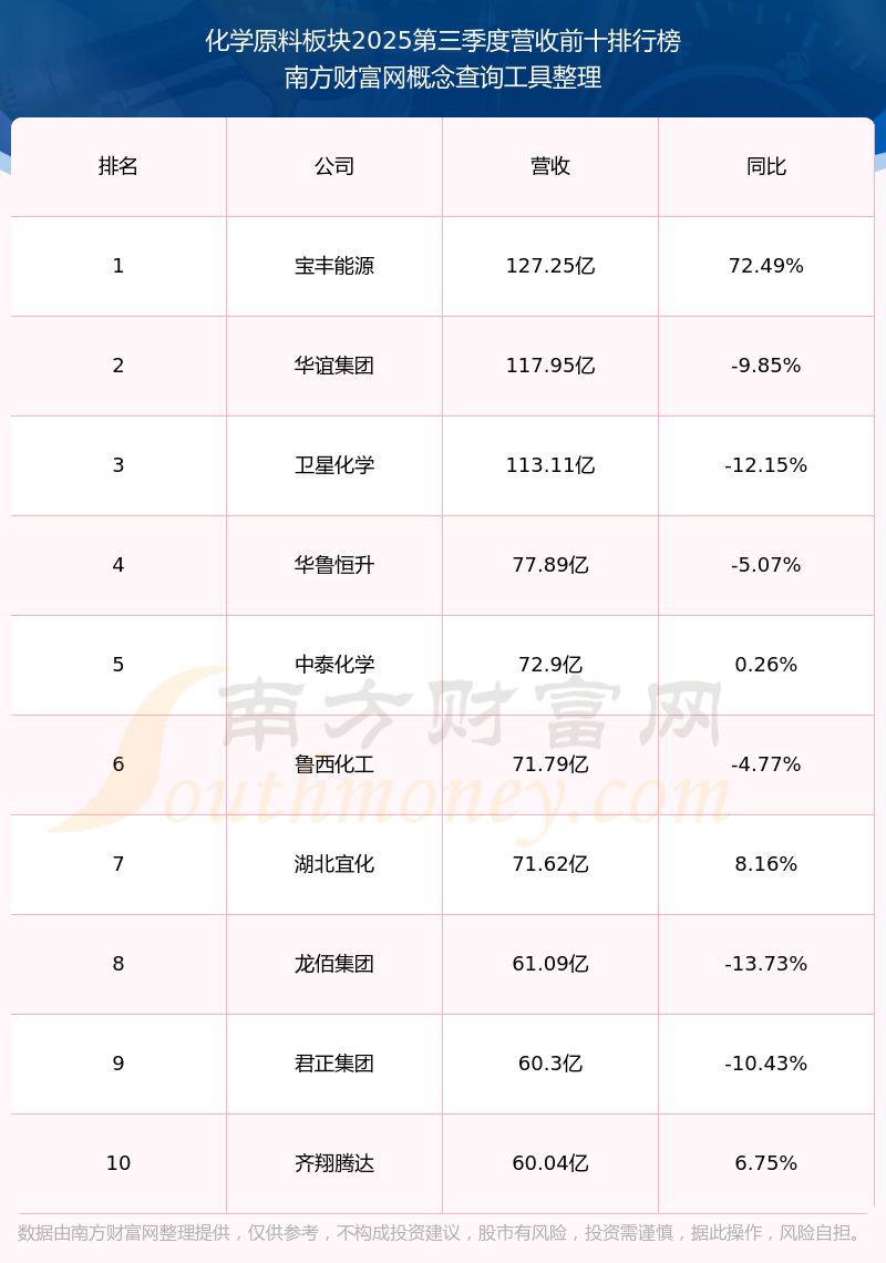 按照南方財(cái)富網(wǎng)概念查詢工具統(tǒng)計(jì),該股所屬板塊為化學(xué)原料板塊,該板塊共有105只股票,和邦生物2025第三季度營(yíng)收在該板塊中排名為第25名,該板塊2025第三季度營(yíng)收排名前十的股票如下表: