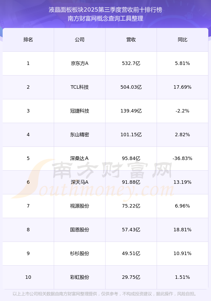按照南方財(cái)富網(wǎng)概念查詢工具統(tǒng)計(jì),該股所屬板塊為液晶面板板塊,該板塊共有78只股票,彩虹股份2025第三季度營(yíng)收在該板塊中排名為第10名,該板塊2025第三季度營(yíng)收排名前十的股票如下表: