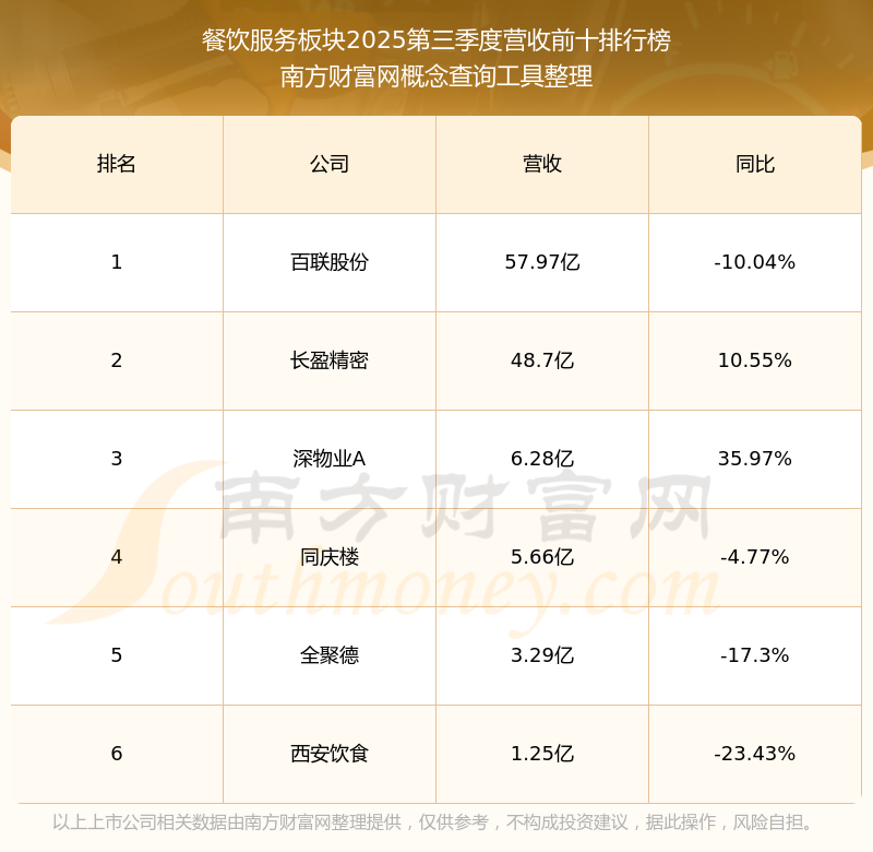 按照南方財富網(wǎng)概念查詢工具統(tǒng)計,該股所屬板塊為餐飲服務(wù)板塊,該板塊共有6只股票,同慶樓2025第三季度營收在該板塊中排名為第4名,該板塊2025第三季度營收排名前十的股票如下表: