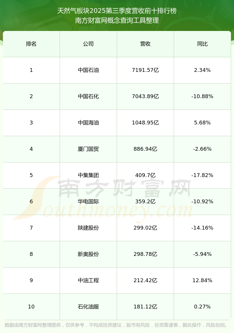 按照南方財(cái)富網(wǎng)概念查詢(xún)工具統(tǒng)計(jì),該股所屬板塊為天然氣板塊,該板塊共有155只股票,藍(lán)天燃?xì)?025第三季度營(yíng)收在該板塊中排名為第84名,該板塊2025第三季度營(yíng)收排名前十的股票如下表: